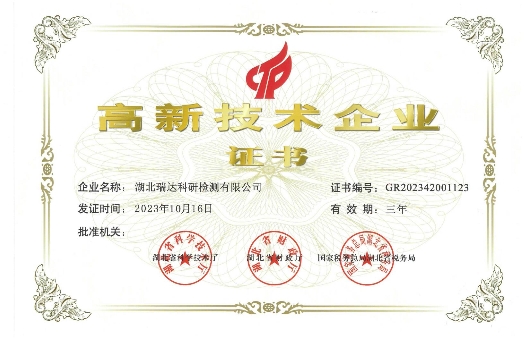 近日,湖北路橋瑞達(dá)檢測(cè)公司收到由湖北省科學(xué)技術(shù)廳、湖北省財(cái)政廳、國(guó)家稅務(wù)總局湖北省稅務(wù)局共同頒發(fā)的“高新技術(shù)企業(yè)”證書(shū),這是瑞達(dá)檢測(cè)公司首次榮獲此項(xiàng)認(rèn)定,標(biāo)志著瑞達(dá)檢測(cè)公司在科技創(chuàng)新和產(chǎn)業(yè)升級(jí)方面取得了重要突破,正式邁入國(guó)家高新技術(shù)企業(yè)行列。