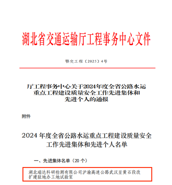 近日,湖北省交通運輸廳工程事務中心發(fā)布了《關于2024年度全省公路水運重點工程建設質量安全工作先進集體和先進個人的通報》,瑞達科研檢測公司武黃改擴建高速公路駐地辦工地試驗室在工程建設過程中扎實落實安全質量責任,切實履行檢測機構使命,憑借突出表現(xiàn)榮獲“先進集體”稱號。